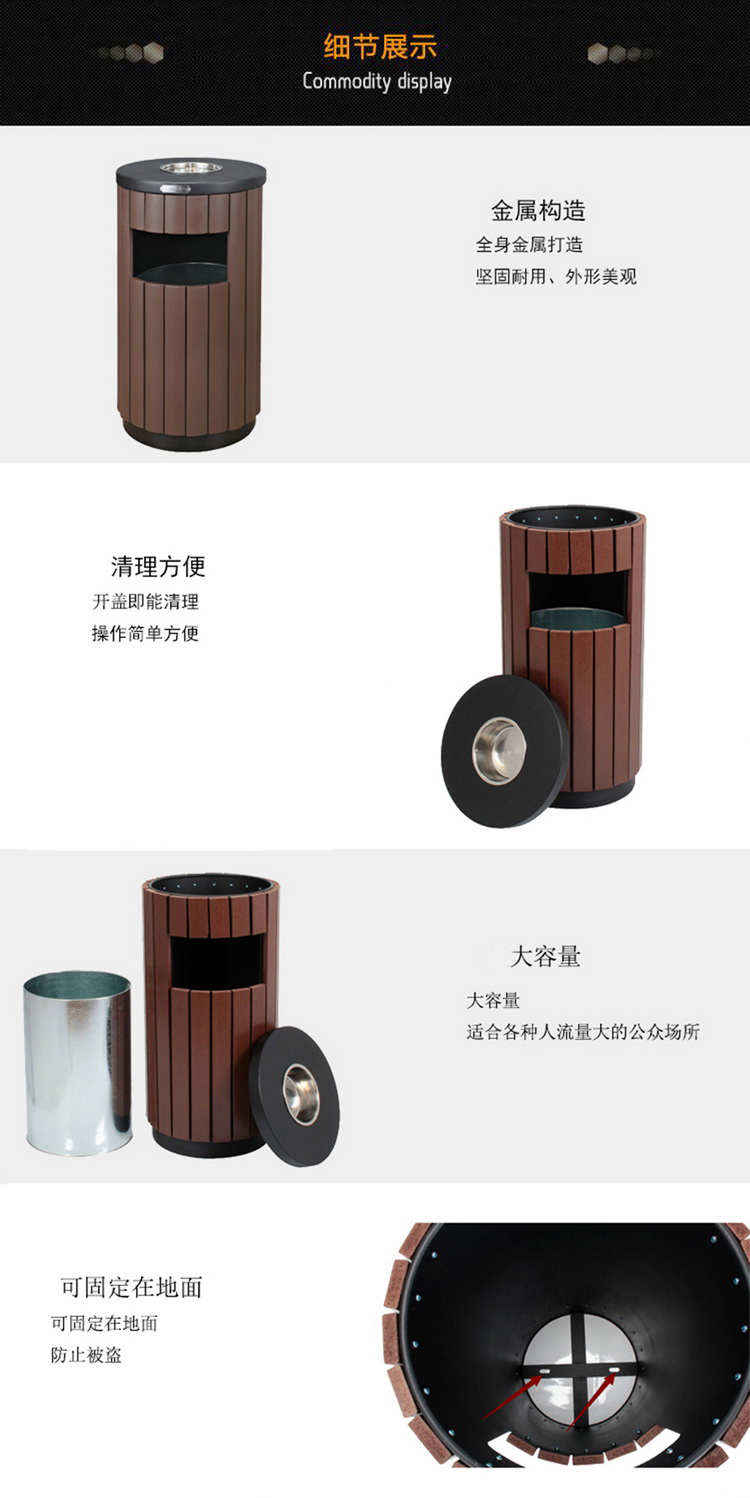 此款垃圾桶新款上市,做工精美,款式新穎,外觀自然簡(jiǎn)樸,采用特別的防銹處理,戶外漆噴涂,防腐、防日光照射,經(jīng)久耐用,做工精美,質(zhì)量有保證。整體圓型設(shè)計(jì),頂部配備煙灰缸,側(cè)面投口更方便,配備優(yōu)良加厚內(nèi)桶。適用于:各銀行、車站、學(xué)校、醫(yī)院、郵局、劇院、空港、機(jī)場(chǎng)、地鐵、商場(chǎng)超市,展覽展示中心、酒店、俱樂(lè)部、會(huì)所、商務(wù)樓宇等。